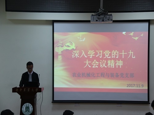研究生农业机械化工程与装备第一、二党支部全体党员和入党积极分子在工程楼A111召开主题为“不忘初心,砥砺前行——为实现伟大梦想贡献智慧与力量”的党支部活动,深入学习党的十九大精神。会议由第二党支部书记杨全军主持。