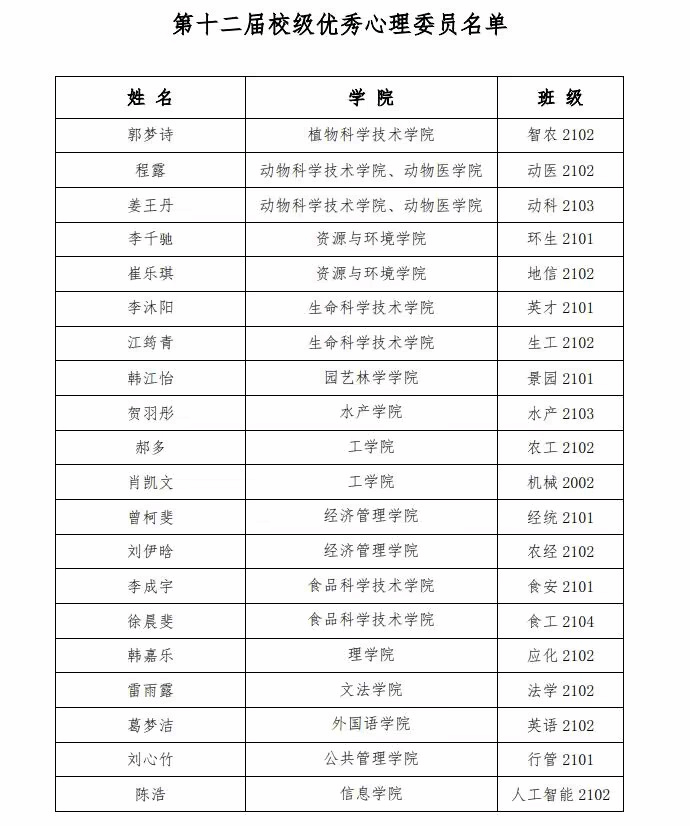 5月30日,学校发布通知,经个人申请、学院推荐、学校集体评议,酷爱成人网 机械2002班肖凯文、农工2102班郝多荣获“酷爱成人网 第十二届校级优秀心理委员”荣誉称号。